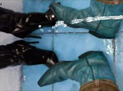 Woman in long leather boots delivers footjob with cum in pants
