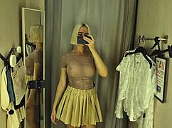 blonde girl tries on see-through clothes in public changing room, showing her ass