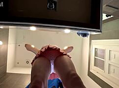 horny braless brunette flashes ass legs in bathroom skirt