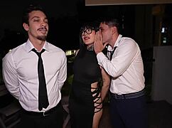 Umazana brunetka kurba nabita in prekrita s cumom med gangbangom 😈