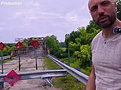 busty exhibitionist milf flashes tits then bends over abandoned bridge for public doggystyle cumshot pounding