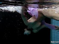 Aneta squeezes big tits in purple dress underwater pool tease