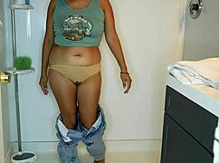 Latina soaks her jeans and panties then strips for a messy wet shower with big tits