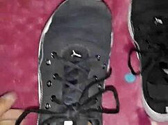 cumshot lands right on the tennis shoes in fetish play.